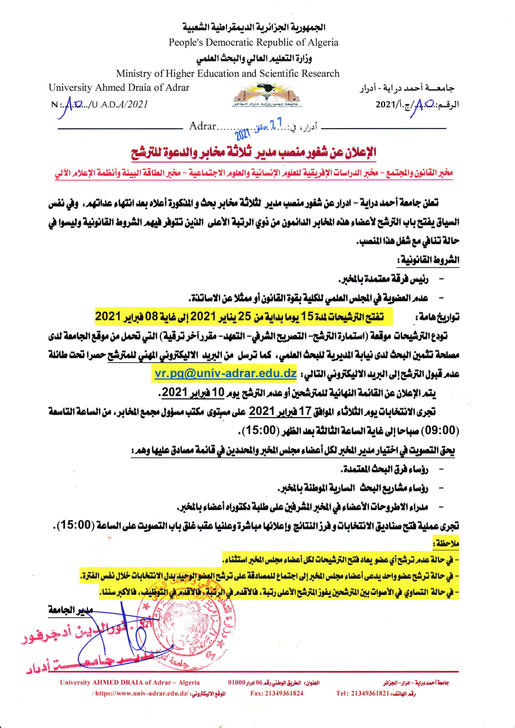 الإعلان عن شغور منصب مدير ثلاثة مخابر والدعوة للترشح تحميل استمارة الترشح 722 Share FacebookGoogle+البريد الإلكترونيTwitter