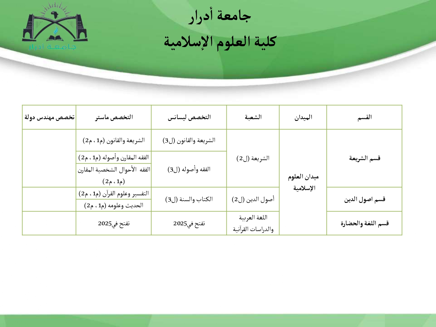 تخصصات كلية العلوم الإسلامية ﺍﻟﺒــﻮﺍﺑﺔ ﺍﻹﻟﻜﺘﺮﻭﻧﻴـﺔ ﻟﺤﺎﻣﻠﻲ ﺷﻬﺎﺩﺓ ﺍﻟﺒﻜﺎﻟﻮﺭﻳﺎ 2025 التكوين في الطور الأول التكوين في الطور الثاني ليسانس ماستر ﺍﻟﺒــﻮﺍﺑﺔ ﺍﻹﻟﻜﺘﺮﻭﻧﻴـﺔ ﻟﺤﺎﻣﻠﻲ ﺷﻬﺎﺩﺓ ﺍﻟﺒﻜﺎﻟﻮﺭﻳﺎ 2025
